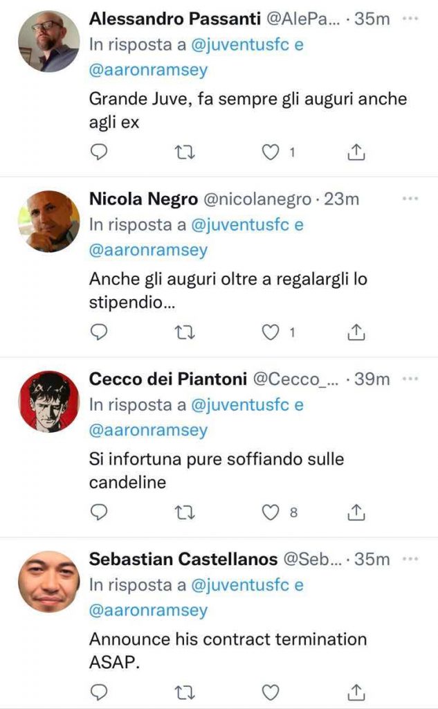 Intanto i tifosi bianconeri si sono scatenati nel post Twitter della Juventus dedicato al compleanno dell’ex capitano dell’Arsenal. Diversi sostenitori bianconeri non hanno dubbi e invocano a gran voce la cessione a gennaio del giocatore: tra battute e analisi puramente tecnico-tattiche, ce n’è per tutti i gusti. Intanto – come ribalza dall’Inghilterra – proprio l’Arsenal starebbe pensando di riportare a Londra il centrocampista gallese. Il tecnico dei londinesi Arteta ha chiesto rinforzi a metà campo e il profilo di Ramsey farebbe sempre breccia nella dirigenza dei ‘Gunners’.