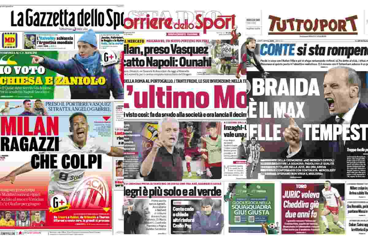Per ‘Il Corriere dello Sport’ la prima pagina è dedicata alla Roma e al suo condottiero: “L’ultimo Mou”, sottolineando il camaleontismo del portoghese “Mai visto così: fa da scudo alla società e ora lancia il decimo baby”. Gli ultimi sono appunto Tahirovic e Majchrzak. Non solo, perché oggi inizia ufficialmente il calciomercato: “Milan, preso Vasquez. Scatto Napoli: Ounahi”, scrive il Corriere sul blitz di De Laurentiis per il marocchino. E ancora su Inter-Napoli: “Inzaghi-Lucio vale una carriera”. Poi la Juventus: “Allegri è più solo e al verde”. E Conte che chiede rinforzi al Tottenham.