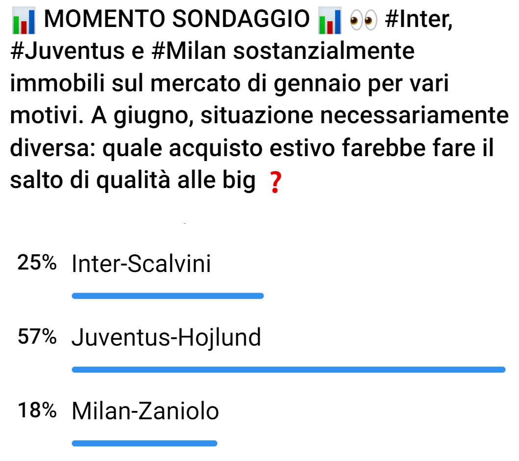 Considerati i pochi movimenti invernali, ai tifosi di Inter, Juventus e Milan abbiamo chiesto nel sondaggio di questa mattina quale colpo vorrebbero venisse messo a segno per il prossimo giugno.