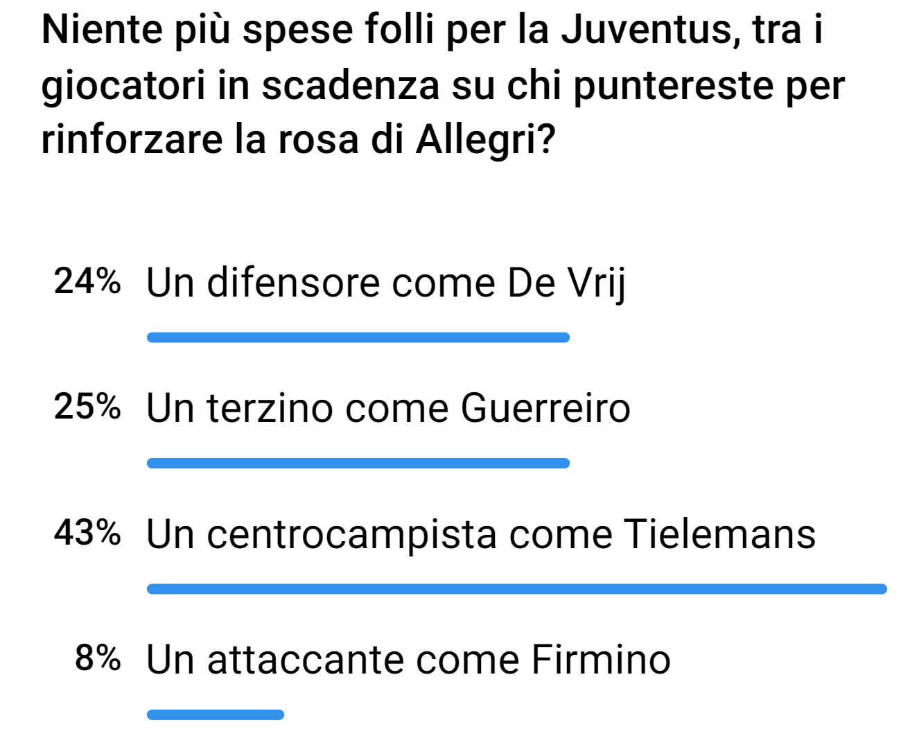 Con il 43%, il primato è stato ottenuto da un obiettivo reale del club torinese come Youri Tielemans. Il centrocampista belga, di proprietà del Leicester, diverrebbe una grande risorsa nelle mani di Massimiliano Allegri. A giocarsi il podio sono stati invece Raphael Guerreiro del Borussia Dortmund con il 25% e Stefan de Vrij con il 24%. Nel mirino della Juve la scorsa estate, infine, non ha attratto grande interesse il nome di Roberto Firmino, altro possibile parametro zero votato solamente dall’8% degli utenti del canale telegram e dunque ultimo nel piazzamento finale.