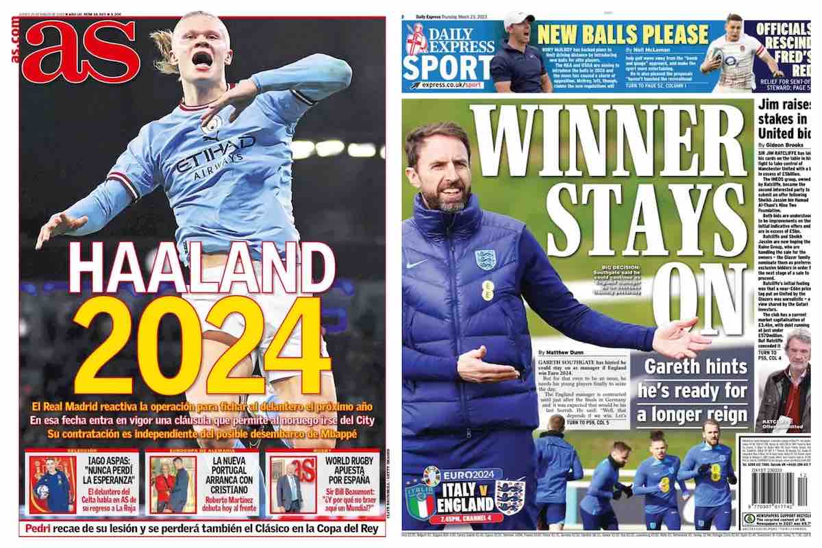 L’Inghilterra e Southgate si giocano molto questa sera nell’impegno delle qualificazioni europee contro l’Italia. La posizione del Ct è sempre delicata “Winner stays on”, titola in prima pagina la sezione sportiva del Daily Express. AS invece in Spagna apre con la caccia del Real Madrid su Haaland, sogno di mercato dei ‘Blancos’ di Florentino Perez: “Haaland 2024”. Le merengue pianificano l’assalto, la clausola con il City può liberare il bomber norvegese.