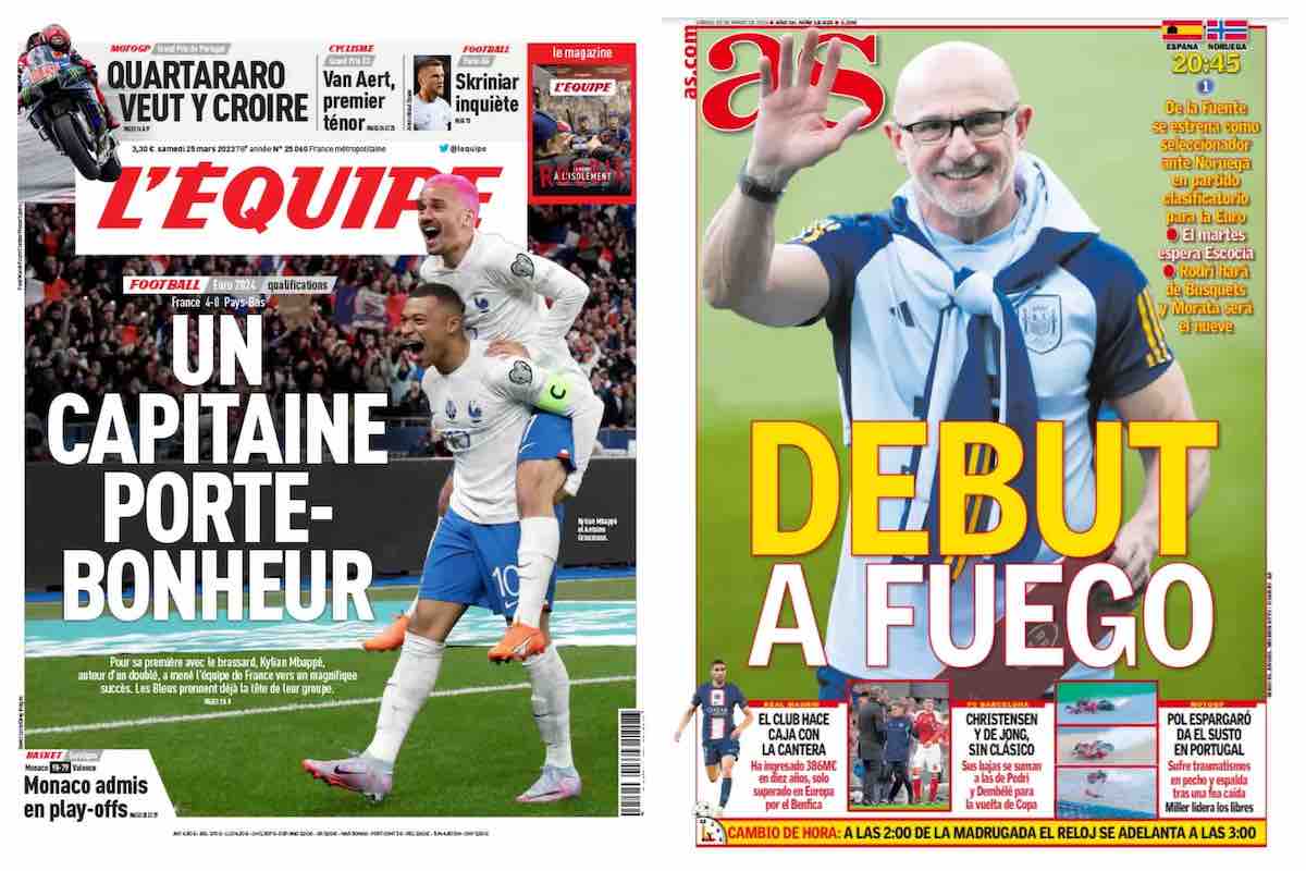 Mbappe continua a trascinare la Francia, prima doppietta da capitano per il fuoriclasse del PSG contro l’Olanda: “Un capitaine porte-bonheur”, si legge sulla prima pagina de L’Equipe. PSG in ansia: “Skriniar inquiète”, i problemi alla schiena del difensore spaventano i parigini. Sula stampa iberica si da risalto all’impegno della Spagna nelle qualificazioni ad Euro 2024 contro la Norvegia: “Debut a fuego”, grade attesa per la prima da Ct delle ‘Furie Rosse’ di De la Fuente.