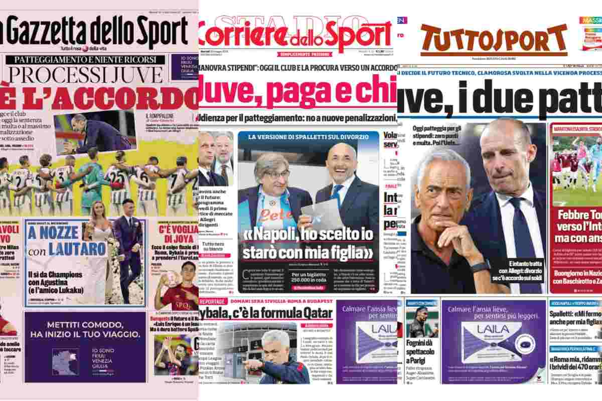 Anche l’apertura del Corriere dello Sport è dedicata al caso Juve: l’obiettivo del club bianconero è quello di risolvere tutti i processi extra-campo entro la prossima stagione, cancellando tutte le pendenze in corso e ripartendo da zero. È anche vigilia di Europa League: domani sera la Roma di Josè Mourinho si giocherà la finalissima di Budapest contro il Siviglia. Dubbio sulla presenza dal primo minuto di Paulo Dybala