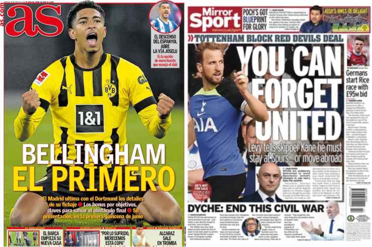 Il quotidiano spagnolo AS fa il punto sul trasferimento di Bellingham al Real Madrid. L’affare sarebbe ormai ai dettagli, con i Blancos che si stanno per aggiudicare il gioiello inglese del Borussia Dortmund. In Inghilterra, infine, il Mirror dedica la propria apertura al futuro di Harry Kane. Il Tottenham blinda ancora il suo capitano, respingendo l’assalto del Manchester United.