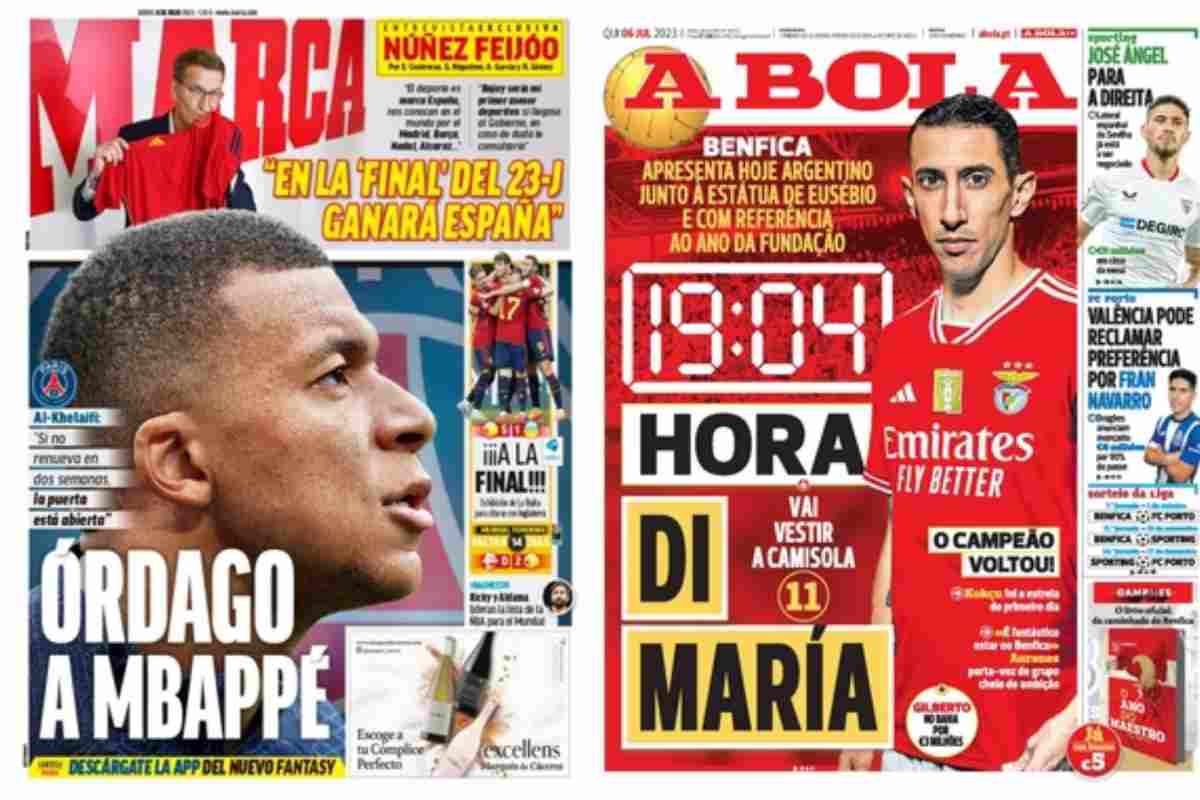 L’apertura di Marca, in Spagna, è dedicata a Kylian Mbappé dopo le parole di Al-Khelaifi. Il Real Madrid e Florentino Perez preparano l’assalto. In Portogallo sono invece i giorni di Di Maria: l’ex Juventus è un nuovo giocatore del Benfica.