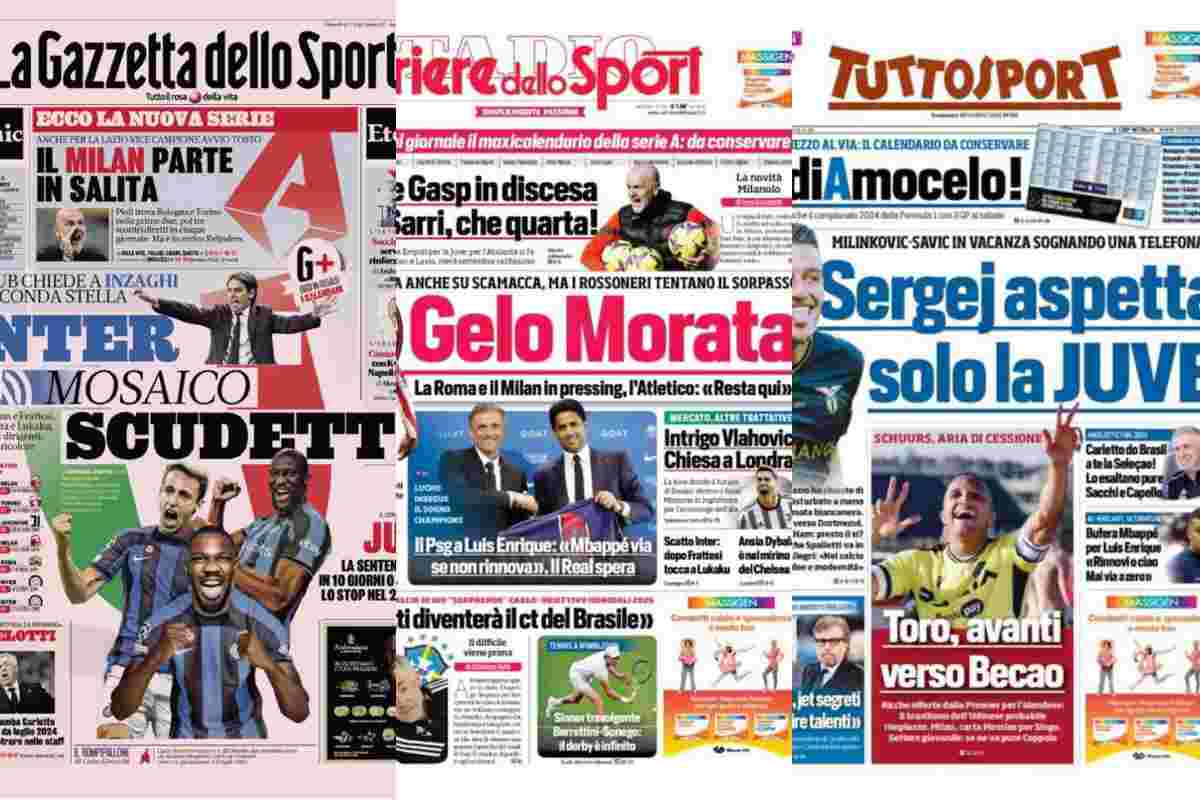 La prima pagine de La Gazzetta dello Sport è dedicata alla nuova Inter di Simone Inzaghi. Dopo Marcus Thuram ecco Frattesi, in attesa di sbloccare il ritorno di Romelu Lukaku. Il Corriere dello Sport dedica la propria apertura tra Luis Enrique-PSG e il futuro di Alvaro Morata. Nel giorno della presentazione del tecnico spagnolo, Al-Khelaifi annuncia su Mbappé: “La nostra posizione è chiara, se vuole rimanere deve firmare il rinnovo di contratto. Non permetteremo che il miglior giocatore del mondo vada via a parametro zero. Lui aveva detto che non avrebbe lasciato Parigi gratuitamente, se ha cambiato idea non è colpa mia”.