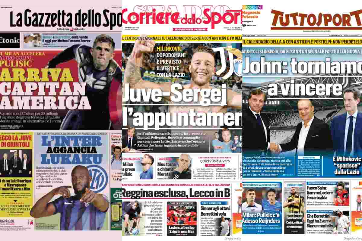 ‘La Gazzetta dello Sport’ apre con Christian Pulisic: “Arriva Capitan America”, si legge in prima pagina. Poi “Il Milan accelera, altro colpo: Pulisic!” Ma l’altra trattativa che si sta scaldando in maniera importante è sull’altra sponda del naviglio. “L’Inter aggancia Lukaku”, scrive la rosea in prima pagina. “La trattativa decolla: Onana a un passo dallo United”, spiega il sottotitolo. Il belga non sarebbe “mai stato così vicino” al ritorno, a titolo definitivo stavolta. Poi di spalla “Ecco la Juve di Giuntoli”. A cui si aggiunge “Il ds su Luiz Henrique e Mavropanos, i nuovi Kvara e Kim”.