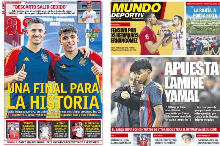 In Spagna l’attenzione è tutta sulla finale dell’Europeo under 21 di questa sera tra la Rojita e l’Inghilterra. “Una final para la historia”, si legge in prima pagina su ‘AS’. La Spagna può essere infatti la prima e unica nazionale con 6 titoli continentali under 21. Sul ‘Mundo Deportivo’ invece c’è “Apuesta Lamine Yamal”. L’ennesimo talento del Barcellona infatti è pronto a essere blindato non appena compirà 16 anni.