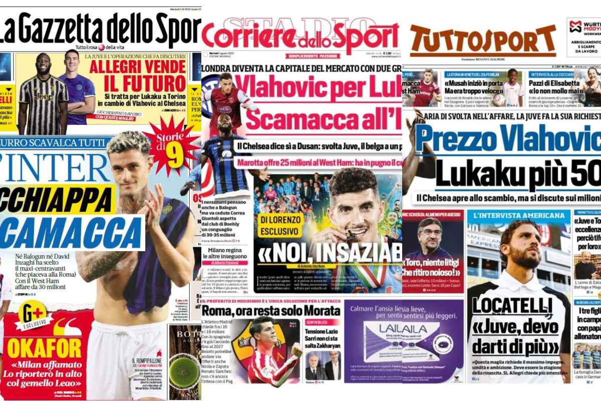 Infine ‘Tuttosport’ che apre con ‘Prezzo Vlahovic: Lukaku più 50‘. Il Chelsea ha aperto allo scambio, ora si discute sui milioni in favore dei bianconeri come conguaglio. E in testa ‘Inter, svolta Scamacca: 20 milioni al West Ham’, “Musah iniziò in porta. Ma era troppo veloce”. Poi ancora l’intervista a Locatelli: “Juve, devo darti di più”. C’è anche la battuta di Juric: “Toro, niente ligiti. Che ritiro noioso!”