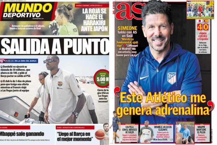 Sul ‘Mundo Deportivo’ si parla dell’addio di Ousmane Dembele al Barcellona: ‘Salida a punto’, il titolo in prima pagina. Il francese non ha pagato la clausola da 50 milioni e ora la cifra della stessa clausola è salita a 100, ma il calciatore ha chiesto al suo club di trattare la cessione col PSG. Su ‘AS’, invece, l’intervista esclusiva a Diego Simeone: “Este Atletico me genera adrenalina”. Tra i temi trattati e inseriti in prima pagina c’è anche Alvaro Morata: “Es fundamental, ojala siga”, risponde l’argentino dicendo quindi di sperare nella permanenza dello spagnolo che piace a Inter e Roma.