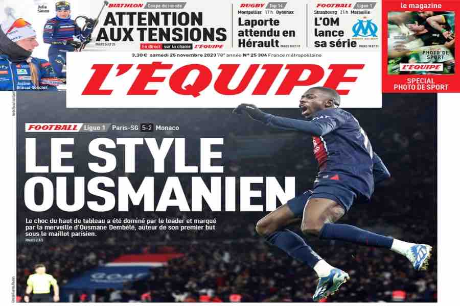 Il Paris Saint-Germain travolte il Monaco nello scontro al vertice, Dembele trascina l’undici di Luis Enrique: “Le style Ousmanien”, si legge sulle pagine de L’Equipe. Il Barcellona nella Liga in emergenza senza Gavi e ter Stegen: “Examen en Vallecas”, titola Mundo Deportivo.