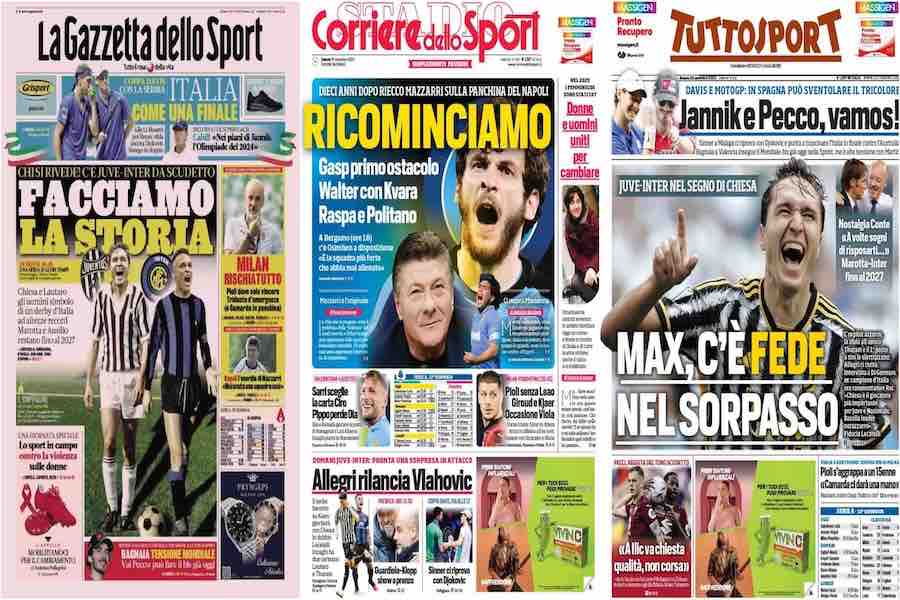 La prima pagina della Gazzetta dello Sport: “Facciamo la storia”. Chi si rivede, c’è Juve-Inter da scudetto: Chiesa e Lautaro gli uomini simbolo del Derby d’Italia. Milan rischiatutto: Pioli deve solo vincere. Napoli, l’esordio di Mazzarri: “Mai avuta una squadra così”. Italia, come una finale: Coppa Davis con la Serbia.