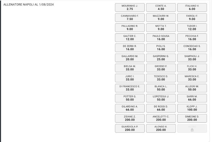Mourinho stacca proprio Antonio Conte, quotato a 4.50. Al terzo posto troviamo Vincenzo Italiano, del quale De Laurentiis è notoriamente grande estimatore. Staccati e staccatissimi tutti gli altri, dall’ex Fabio Cannavaro (7.50) all’altro ex Maurizio Sarri (66.00). Tra i nomi troviamo anche lo stesso Mazzarri, la cui conferma è quotata a 9.00 e, udite udite, un certo Pep Guardiola, a 200.00 come il collega della rivelazione Bayer Leverkusen, lo spagnolo Xabi Alonso.