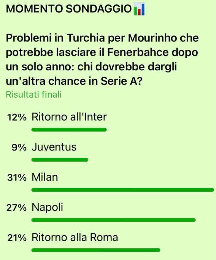 Ecco perché – attraverso il nostro sondaggio odierno – su Telegram abbiamo chiesto agli utenti di Calciomercato.it quale club italiano dovrebbe dare un’altra occasione allo Special One. Del resto i ricordi e i trofei lasciati in dote da Mourinho prima all’Inter e poi alla Roma rappresentano un marchio indelebile. A tal proposito, balza subito all’occhio il verdetto finale: il 31% degli utenti che ha risposto al sondaggio ritiene infatti che debba essere il Milan a fiondarsi con decisione sull’allenatore del Fenerbahçe.