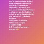 Ecco l’appello lanciato attraverso una storia pubblicata su ‘Instagram’: “Ragazzi ho perso il mio orologio a cui ero molto legato con il quale ho condiviso tutta la mia carriera. Mi rivolgo a tutti voi nella speranza che possiate trovarlo! So che è quasi impossibile ma tentar non nuoce. Si tratta di un Daytona acciaio con quadrante bianco e nel cinturino ha due placchette con la lettera C (Christian e Chanel). Vi ringrazio in anticipo… Vi lascio un recapito, 3488888940, verrò io di persona a prenderlo”.
