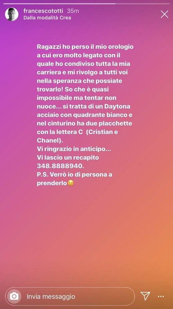 Ecco l’appello lanciato attraverso una storia pubblicata su ‘Instagram’: “Ragazzi ho perso il mio orologio a cui ero molto legato con il quale ho condiviso tutta la mia carriera. Mi rivolgo a tutti voi nella speranza che possiate trovarlo! So che è quasi impossibile ma tentar non nuoce. Si tratta di un Daytona acciaio con quadrante bianco e nel cinturino ha due placchette con la lettera C (Christian e Chanel). Vi ringrazio in anticipo… Vi lascio un recapito, 3488888940, verrò io di persona a prenderlo”.