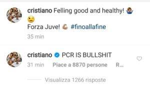 In tema Covid-19, Cristiano Ronaldo torna a far discutere. Sotto a un suo post Instagram, il fuoriclasse della Juventus ha detto a chiare lettere che “il Pcr – ovvero il tampone, ndr – è una ca***ta!”. Ricordiamo che nelle scorse ore il portoghese è stato nuovamente riscontrato positivo al coronavirus e che dunque non ci sarà nel big match di Champions Juventus-Barcellona in programma questa sera all”Allianz Stadium’ di Torino.