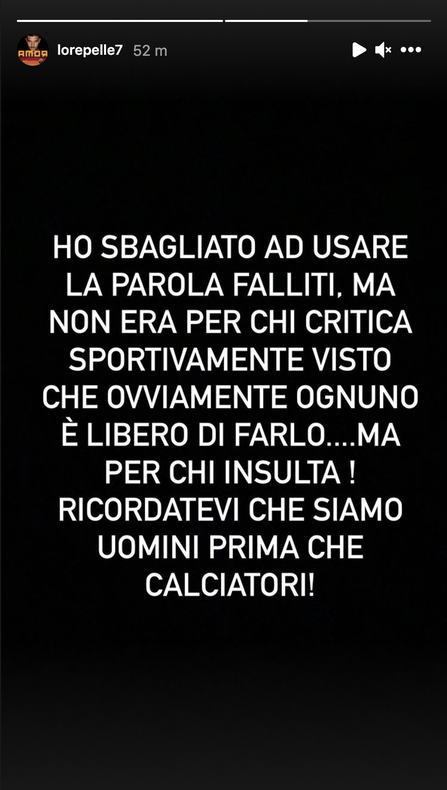 “Ognuno è libero di criticare, ma non di insultare” aggiunge il giocatore, che se la prende con chi sta attaccando il gruppo: Pellegrini, da sempre legato all’ambiente romanista, è intervenuto con grande personalità a difendere i suoi compagni di squadra, al termine di una partita che la Roma ha pareggiato anche per colpa di una prestazione arbitrale non all’altezza. “Ho sbagliato ad usare la parola falliti – il testo integrale della storia di Pellegrini – ma non era per chi critica sportivamente visto che ognuno è libero di farlo… ma per chi insulta! Ricordatevi – conclude il centrocampista – che siamo prima uomini e poi calciatori”.