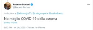 Burioni ancora protagonista, in negativo, su Twitter. Rispondendo a degli utenti, il virologo tifoso della Lazio ha risposto a degli utenti “Meglio il Covid-19 della As Roma“. Il tweet ha scatenato reazione indignate non solo dei tifosi giallorossi. Accortosi della clamorosa gaffe, Burioni ha cancellato il tweet non dando però grandi segnali di pentimento: “Mi scusi – ha replicato a un utente – non pensavo di essere offensivo. Ho cancellato il tweet (ma ormai gli screenshots erano scattati, ndr), mi rendo conto che qui è meglio non fare battute”.
