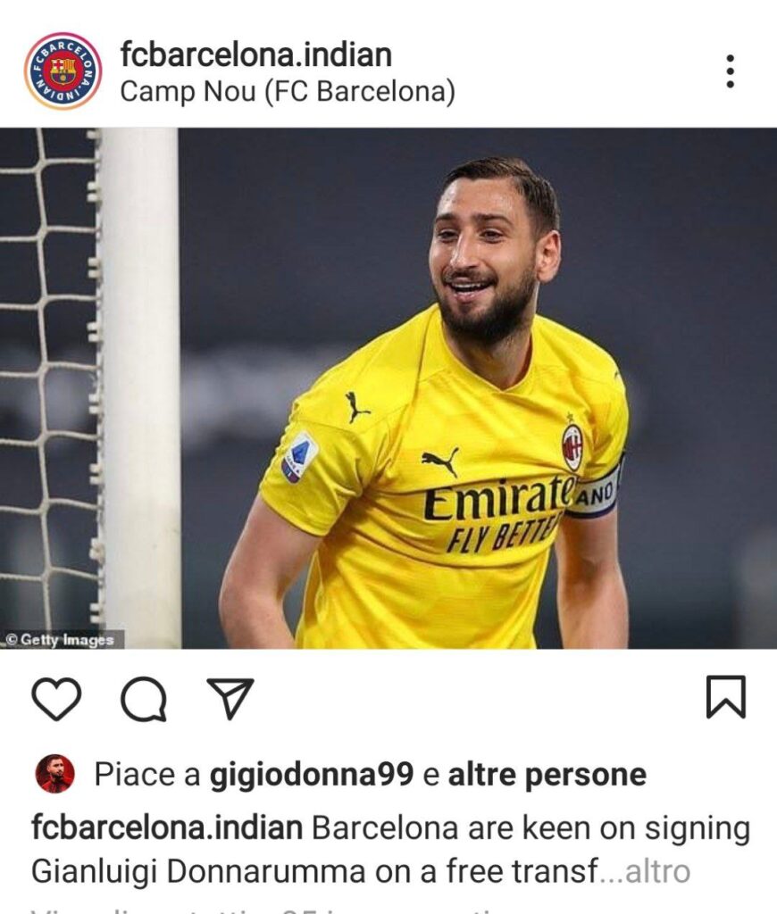 Proprio però in merito all’interesse da Barcellona spunta un indizio social. Pubblicato dalla pagina Instagram ‘fcbarcelona.indian’, il portiere ha lasciato il proprio gradimento ad un post in cui si sottolineava come i catalani fossero intenzionati ad acquistare il portiere italiano a costo zero. E lo stesso Donnarumma ha lasciato il proprio ‘mi piace’. Un indizio certamente su come la pista Barcellona possa essere certamente gradita.