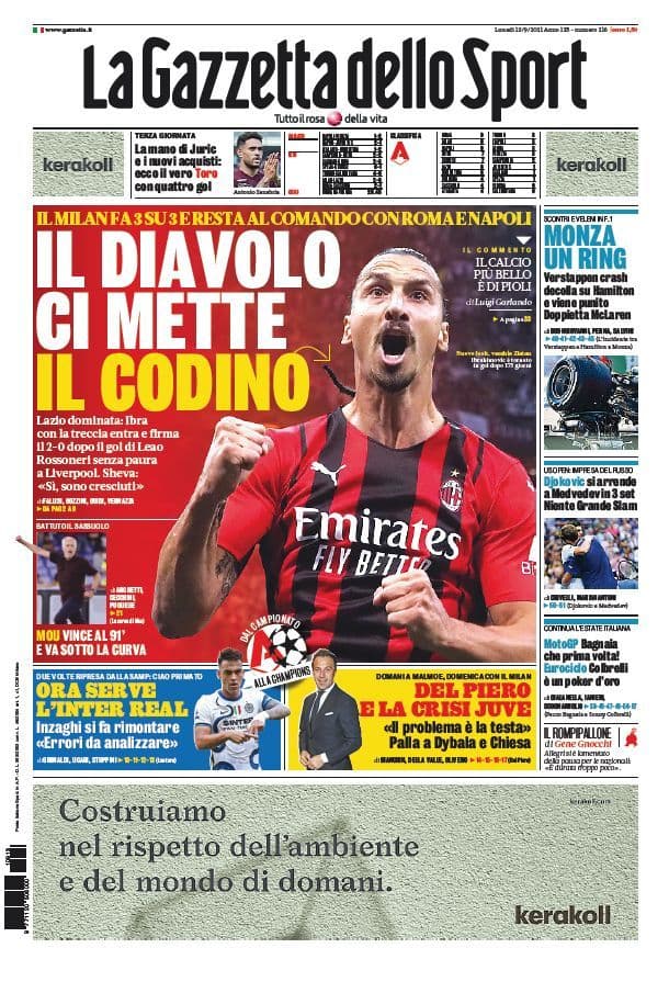 La rassegna stampa di Calciomercato.it vi propone i titoli principali sulla prima pagina di oggi, venerdì 10 settembre 2021, de ‘La Gazzetta dello Sport’: