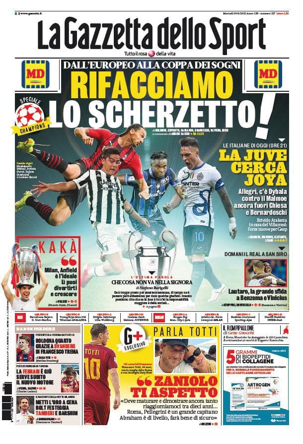 La rassegna stampa di Calciomercato.it vi propone i titoli principali sulla prima pagina di oggi, martedì 14 settembre 2021, de ‘La Gazzetta dello Sport’: