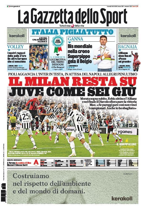 I titoli principali sulla prima pagina del quotidiano sportivo, La Gazzetta dello Sport