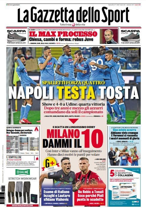 I titoli principali sulla prima pagina del quotidiano sportivo, La Gazzetta dello Sport