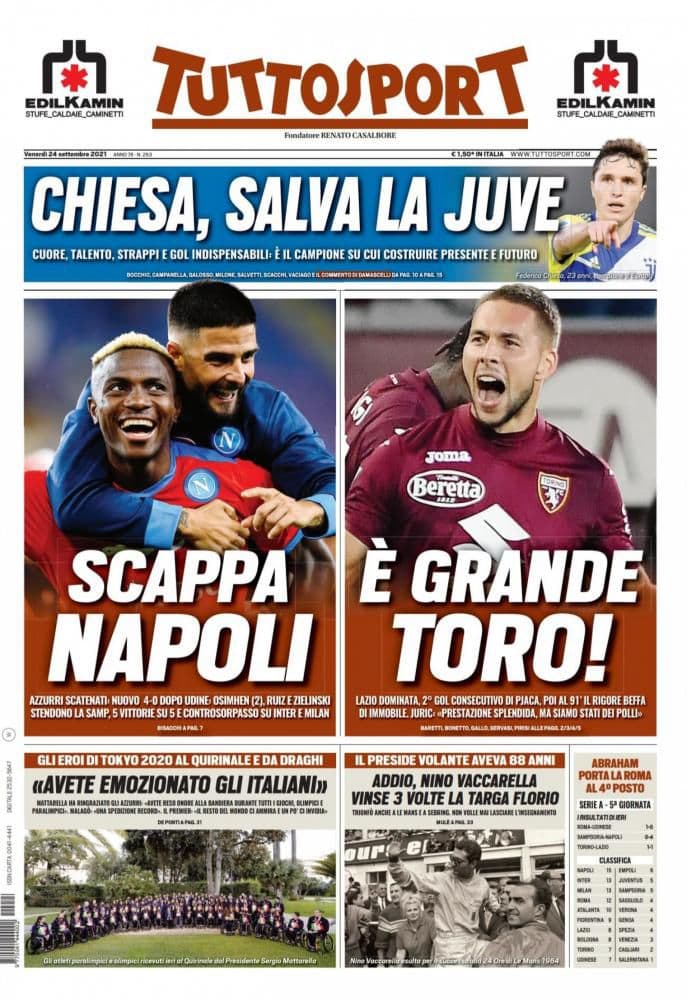 La rassegna stampa di Calciomercato.it vi propone i titoli principali sulla prima pagina di oggi, venerdì 24 settembre 2021, di ‘TuttoSport’: