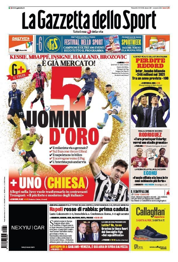 La rassegna stampa di Calciomercato.it vi propone i titoli principali sulla prima pagina di oggi, venerdì 1 ottobre 2021, de ‘La Gazzetta dello Sport’: