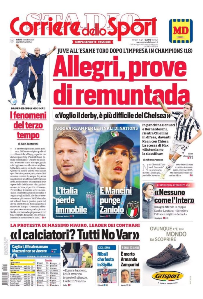 La rassegna stampa di Calciomercato.it vi propone i titoli principali sulla prima pagina di oggi, sabato 2 ottobre 2021, del ‘Corriere dello Sport’: