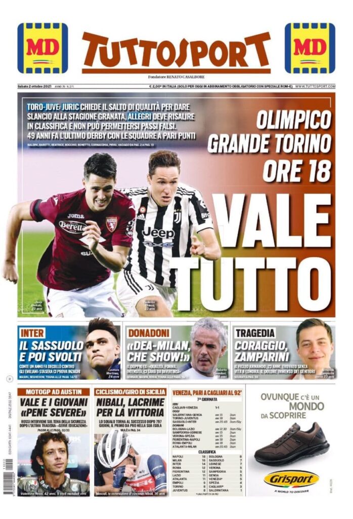 La rassegna stampa di Calciomercato.it vi propone i titoli principali sulla prima pagina di oggi, sabato 2 ottobre 2021, di ‘TuttoSport’: