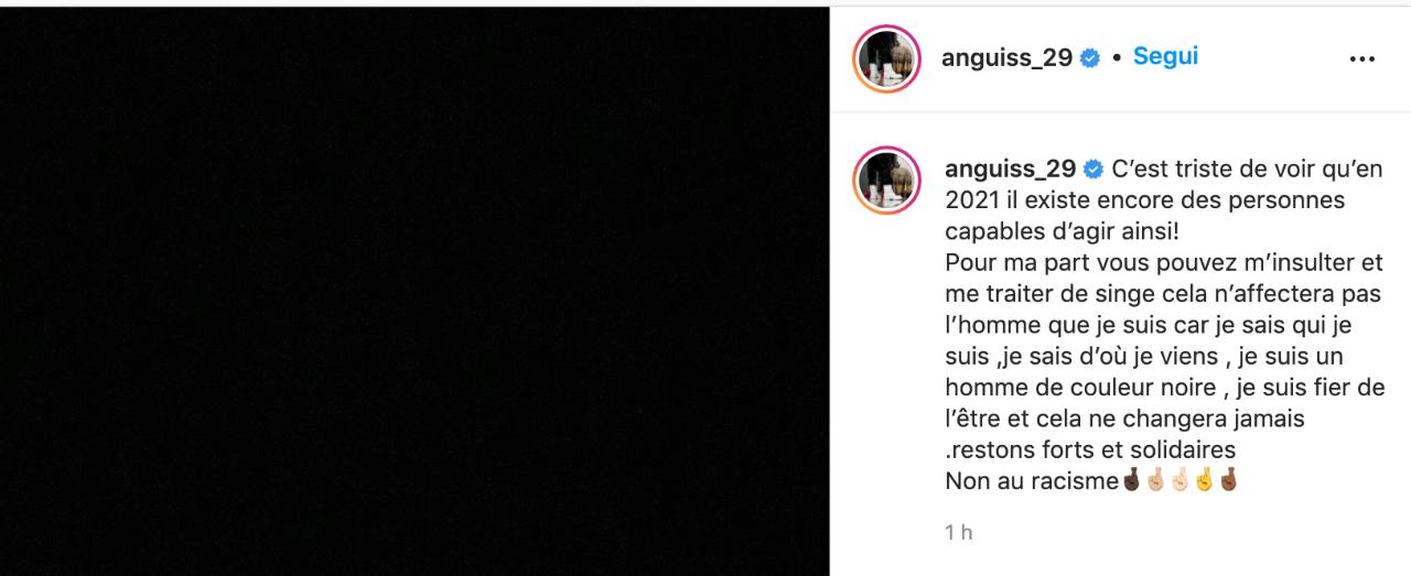 “È triste vedere che nel 2021 ci sono ancora persone che agiscono così. Per quello che penso, una persona può insultarmi e chiamarmi scimmia, questo non influenzerà l’uomo che sono perché so chi sono e so da dove vengo. Sono un uomo di colore, sono orgoglioso di esserlo e questo non cambierà mai. Diciamo no al razzismo” ha scritto in un post pubblicato su Instagram. Copy che è accompagnato da un’immagine completamente nera.