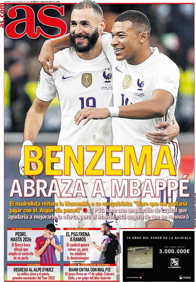La rassegna stampa di Calciomercato.it vi propone i titoli principali sulla prima pagina di oggi, venerdì 15 ottobre 2021, de ‘As’: