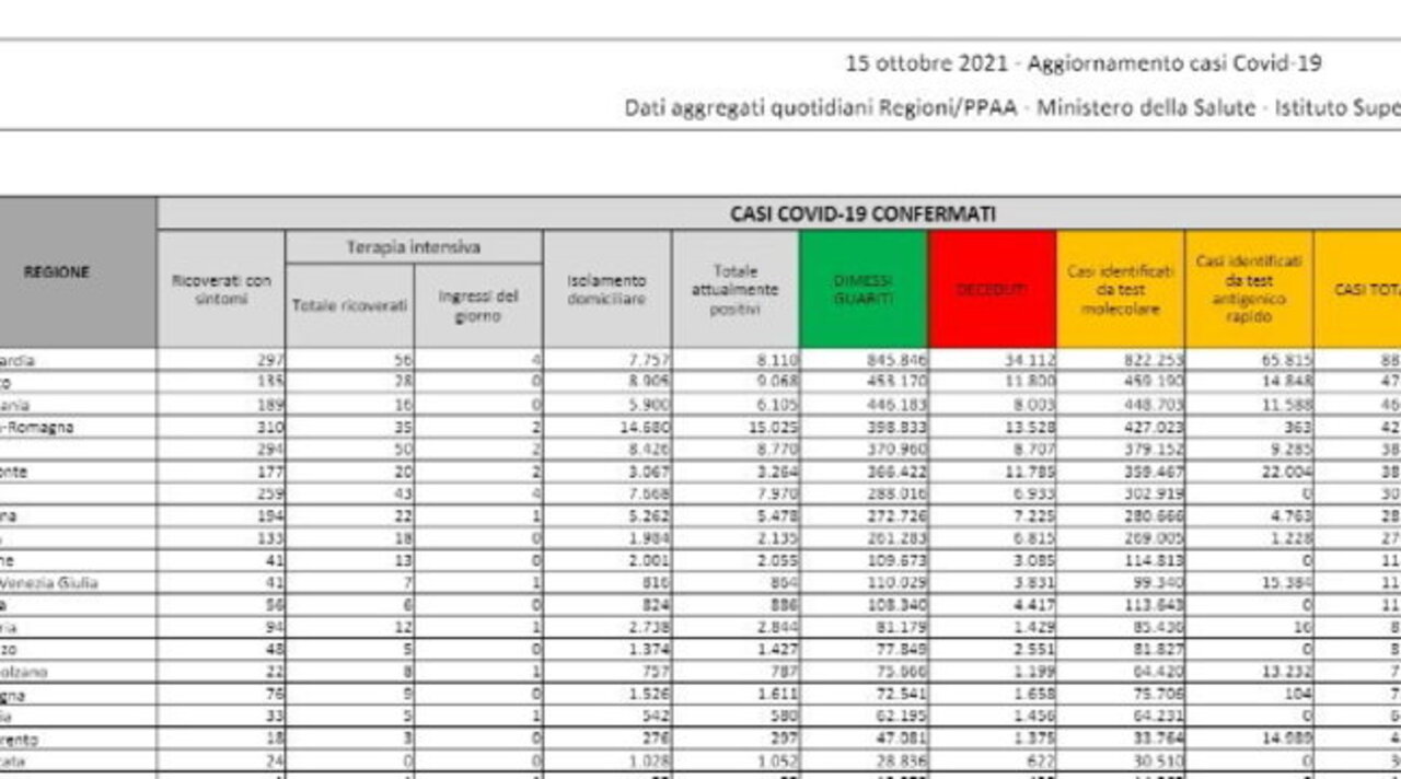 Il Ministero della Salute ha diramato il bollettino sul coronavirus relativo al 15 ottobre 2021. I nuovi positivi sono 2.732 con un totale di tamponi effettuati pari a 506.043: per effetto di questi numeri, il tasso di positività è allo 0,5%. I decessi sono 42, mentre si contano 3.553 guariti.
