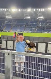 Il saluto romano davanti al pubblico della Tribuna Tevere insieme all’urlo “Duce, duce”. Juan Bernabè, 52enne falconiere spagnolo della Lazio che si prende cura dell’aquila Olympia, è il protagonista in negativo di un video diventato virale su Twitter. Al termine della partita vinta con l’Inter, Bernabè ha fatto il giro di campo con l’aquila appoggiata braccio, omaggiando gli spettatori che avevano assistito al successo per 3-1.
