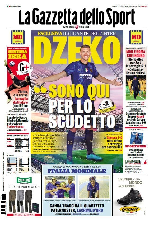 I titoli principali sulla prima pagina del quotidiano sportivo, La Gazzetta dello Sport