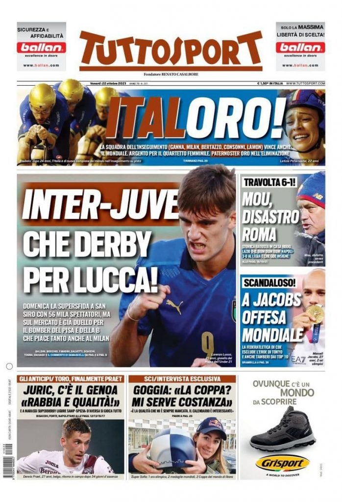 La rassegna stampa di Calciomercato.it vi propone i titoli principali sulla prima pagina di oggi, venerdì 22 ottobre 2021, di ‘TuttoSport’: