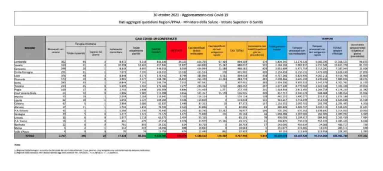 Purtroppo vanno registrati anche 37 morti, per un totale di 132.074 da inizio epidemia. Gli attualmente positivi sono 80.381, 1.738 in più rispetto a ieri. In calo le terapie intensive, 3 in meno (ieri +2) con 20 ingressi del giorno.