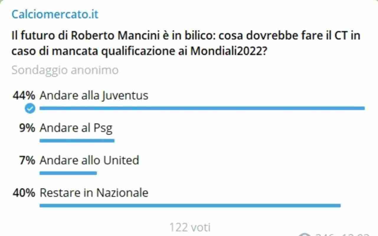 Mancini dovrebbe andare alla Juventus in caso di mancata qualificazione a Qatar 2022 ha preso il 44% dei voti. Per il 40%, invece, dovrebbe proseguire la sua avventura con l’Italia. Per il 9% andare al Psg, per il restante 7% dire sì al corteggiamento del Manchester United.
