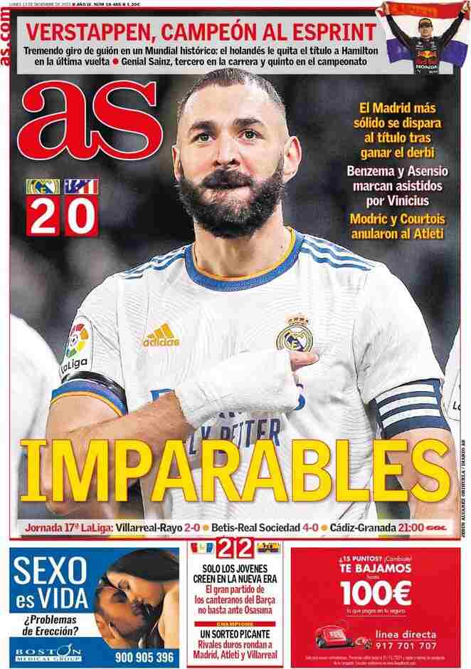 I titoli principali sulla prima pagina del quotidiano sportivo, As