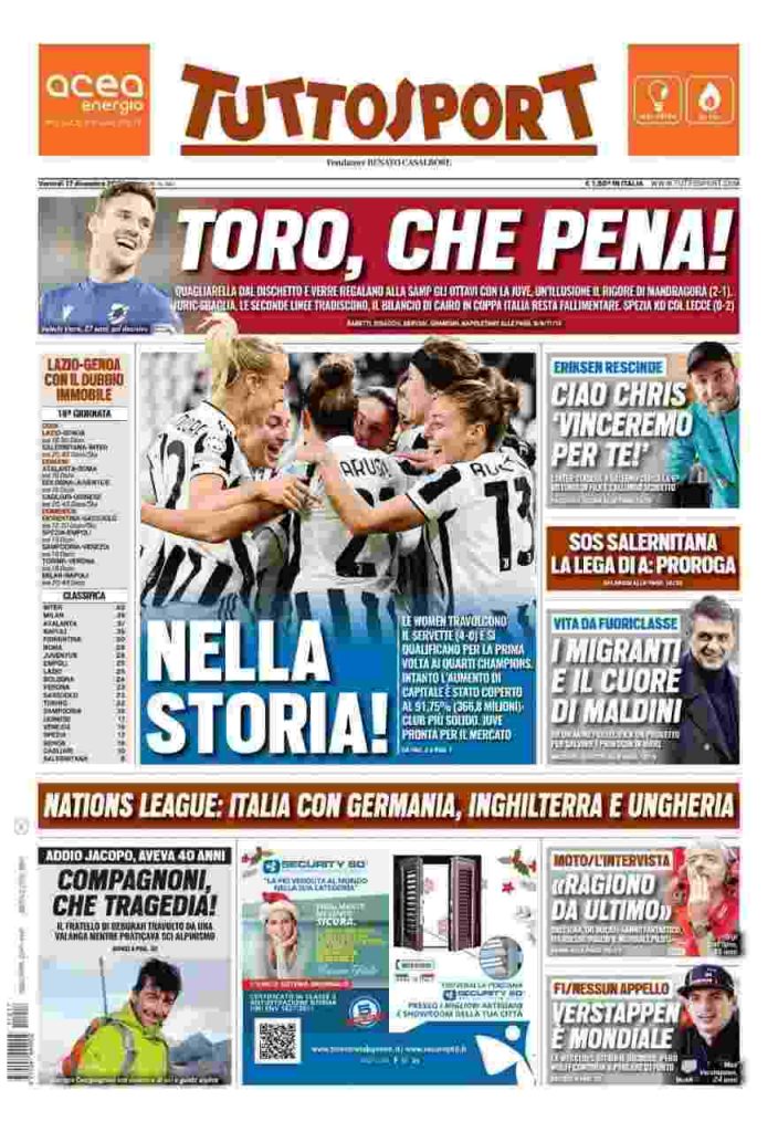 La rassegna stampa di Calciomercato.it vi propone i titoli principali sulla prima pagina di oggi, venerdì 17 dicembre 2021, di ‘TuttoSport’: