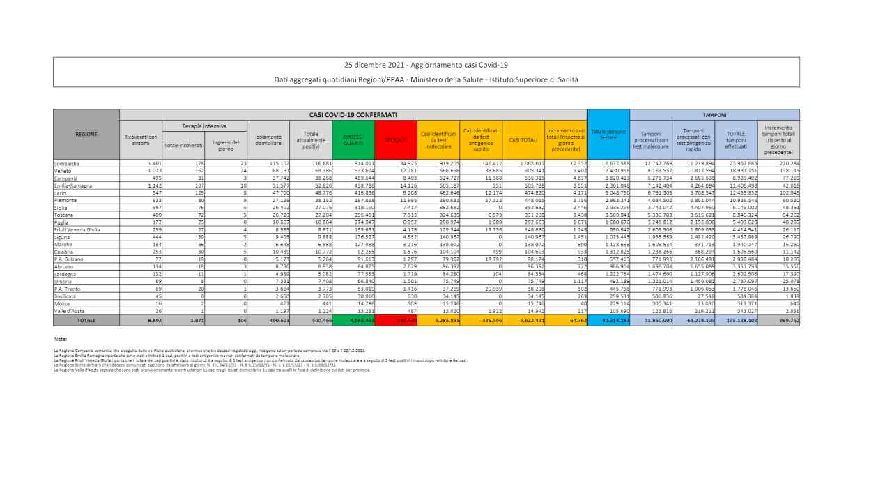 Il bollettino del 25 dicembre dell’emergenza coronavirus nel nostro paese fa segnare il nuovo record giornaliero di contagi: i casi delle ultime 24 ore sono ben 54.762, a fronte di 969.752 tamponi totali. Il numero più elevato in Lombardia, che fa registrare ben 17.332 nuovi casi. 5.402 nuovi casi in Veneto, 4.837 in Campania. 144 i morti, con il totale che sale a 136.530 dall’inizio della pandemia in Italia.
