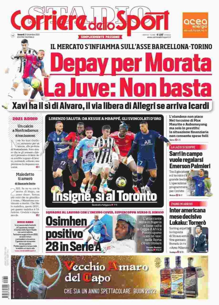 La rassegna stampa di Calciomercato.it vi propone i titoli principali sulla prima pagina di oggi, venerdì 31 dicembre 2021, del ‘Corriere dello Sport’: