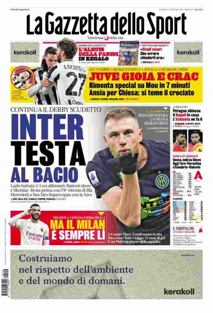 I titoli principali sulla prima pagina del quotidiano sportivo, La Gazzetta dello Sport