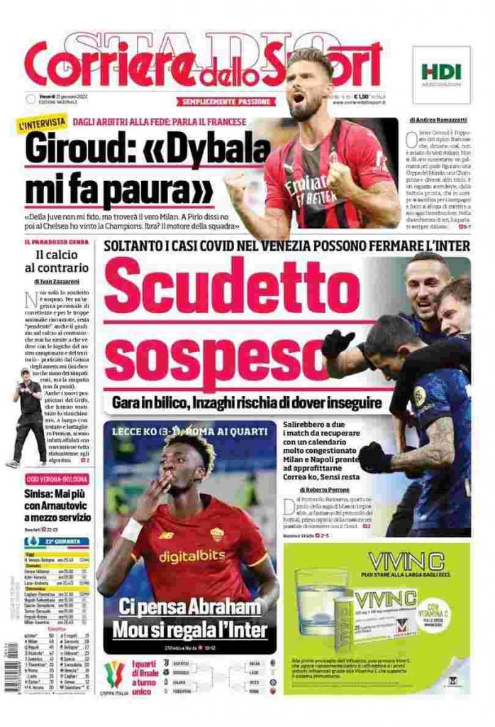 La rassegna stampa di Calciomercato.it vi propone i titoli principali sulla prima pagina di oggi, venerdì 21 gennaio 2022, del ‘Corriere dello Sport’: