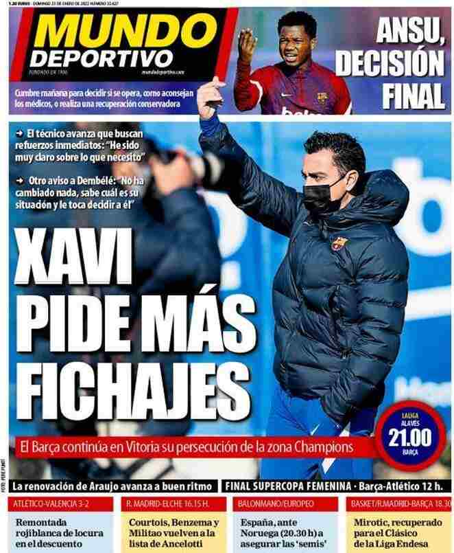 La rassegna stampa di Calciomercato.it vi propone i titoli principali sulla prima pagina di oggi, domenica 23 gennaio 2022, del ‘Mundo Deportivo’:
