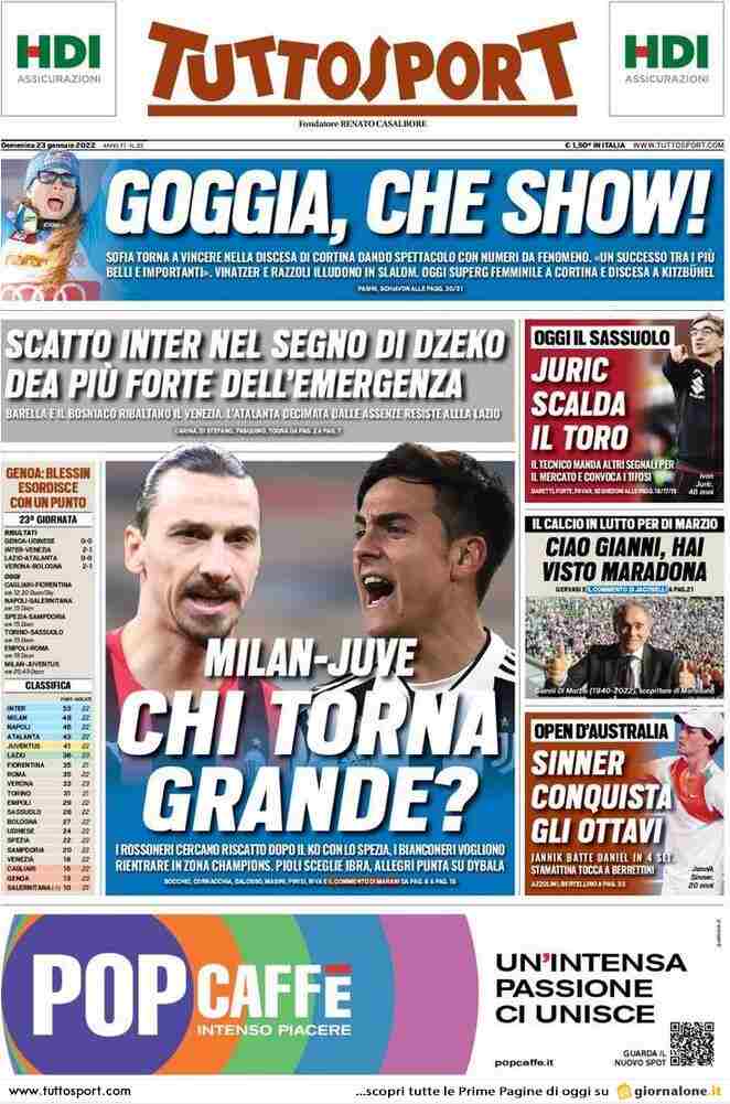 La rassegna stampa di Calciomercato.it vi propone i titoli principali sulla prima pagina di oggi, domenica 23 gennaio 2022, di ‘TuttoSport’: