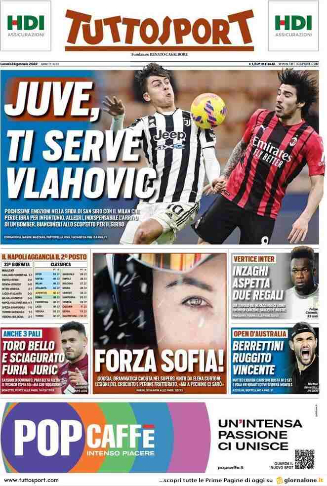 La rassegna stampa di Calciomercato.it vi propone i titoli principali sulla prima pagina di oggi, lunedì 24 gennaio 2022, di ‘TuttoSport’:
