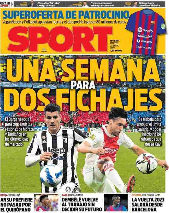 I titoli principali sulla prima pagina del quotidiano sportivo spagnolo, Sport